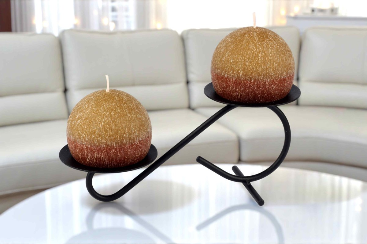 Originální kovový svícen se dvěma stylovými svíčkami.