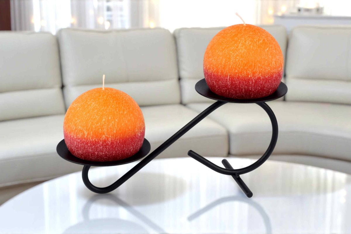 Originální kovový svícen se dvěma stylovými svíčkami.