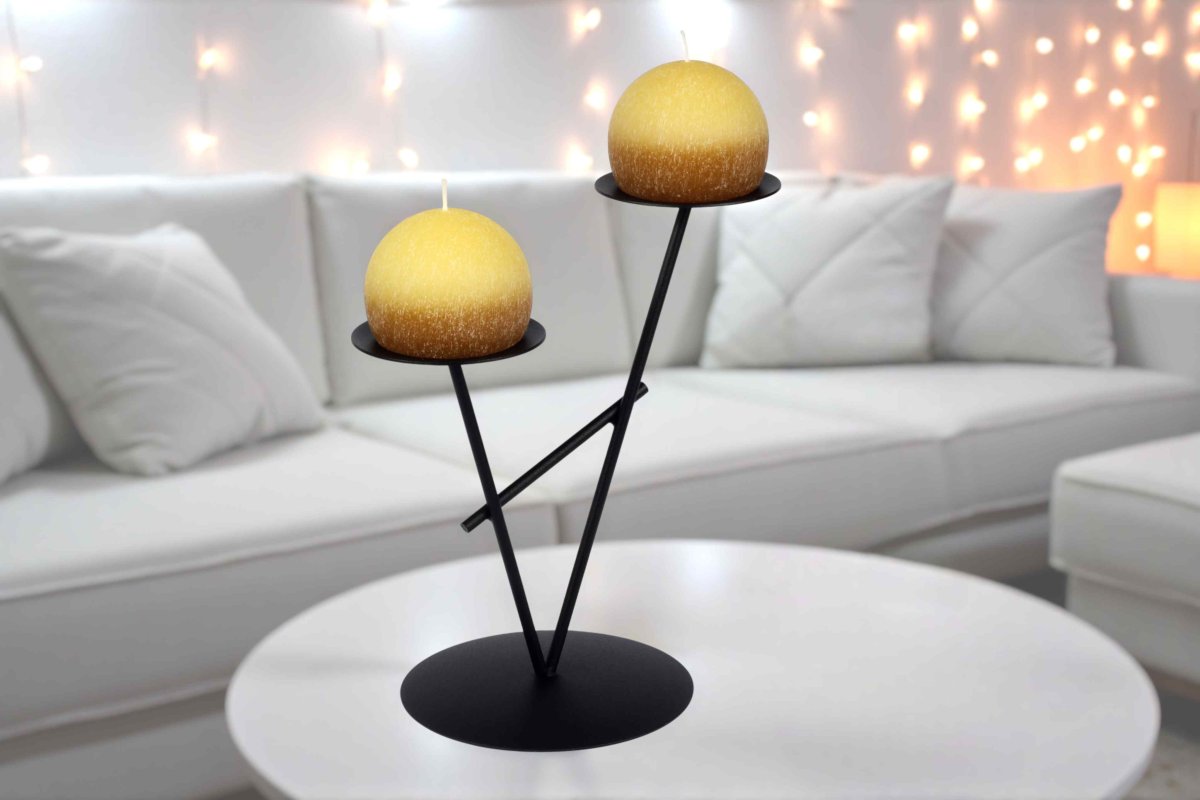 Originální kovový svícen se dvěma stylovými svíčkami.