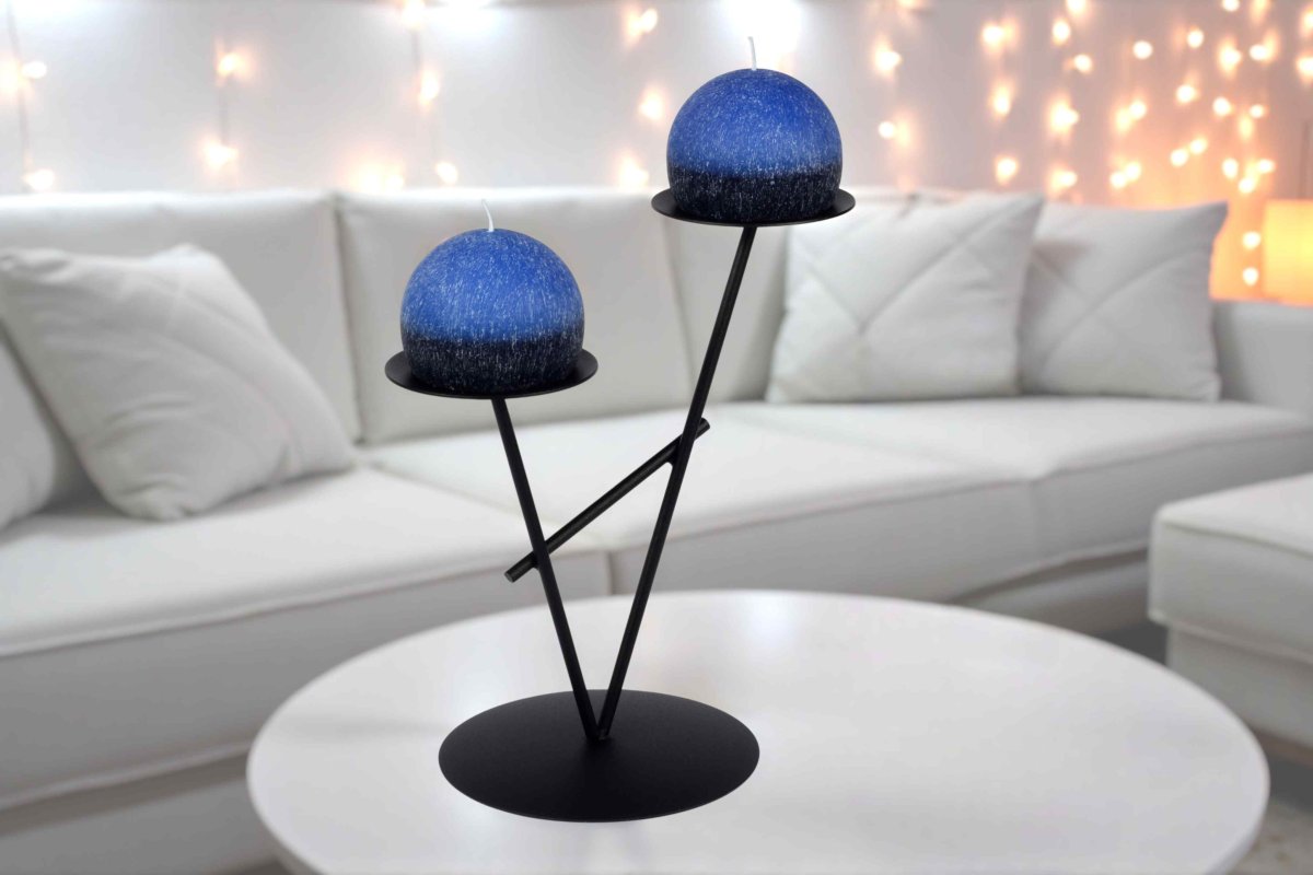 Originální kovový svícen se dvěma stylovými svíčkami.