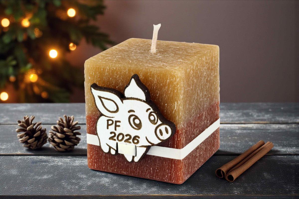 Ručně vyráběná svíčka z kvalitního parafínu s roztomilým motivem prasátka pro štěstí. Originální přání do roku 2026.