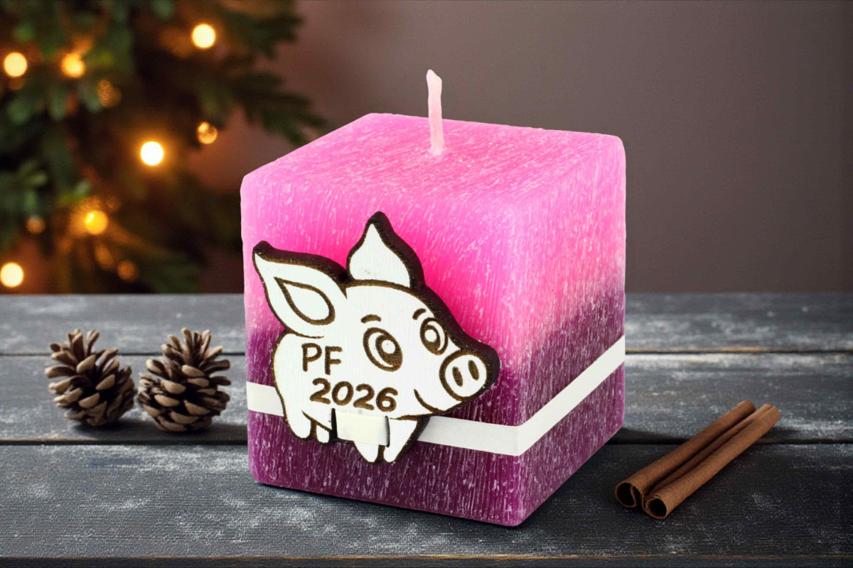 Ručně vyráběná svíčka z kvalitního parafínu s roztomilým motivem prasátka pro štěstí. Originální přání do roku 2026.
