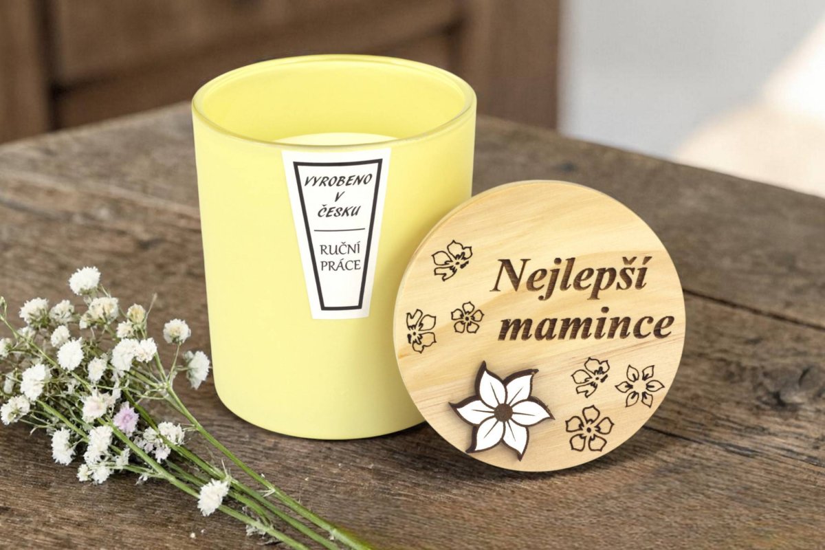 Naše ručně vyráběná svíčka ve skle s elegantním dřevěným víčkem je ideálním dárkem ke Dni matek. Každý kousek je doplněn jemným věnováním přímo na víčku, které udělá z obyčejné svíčky osobní a nezapomenutelný dárek.