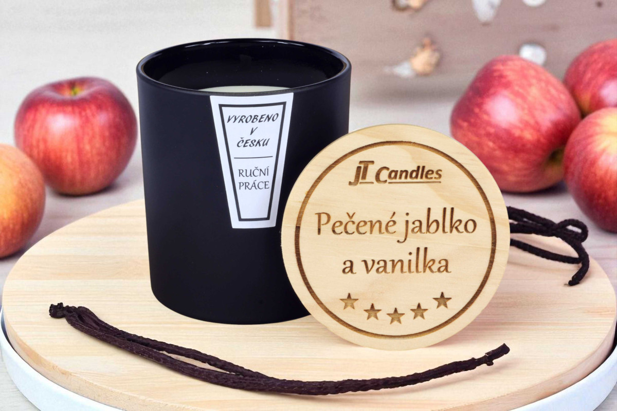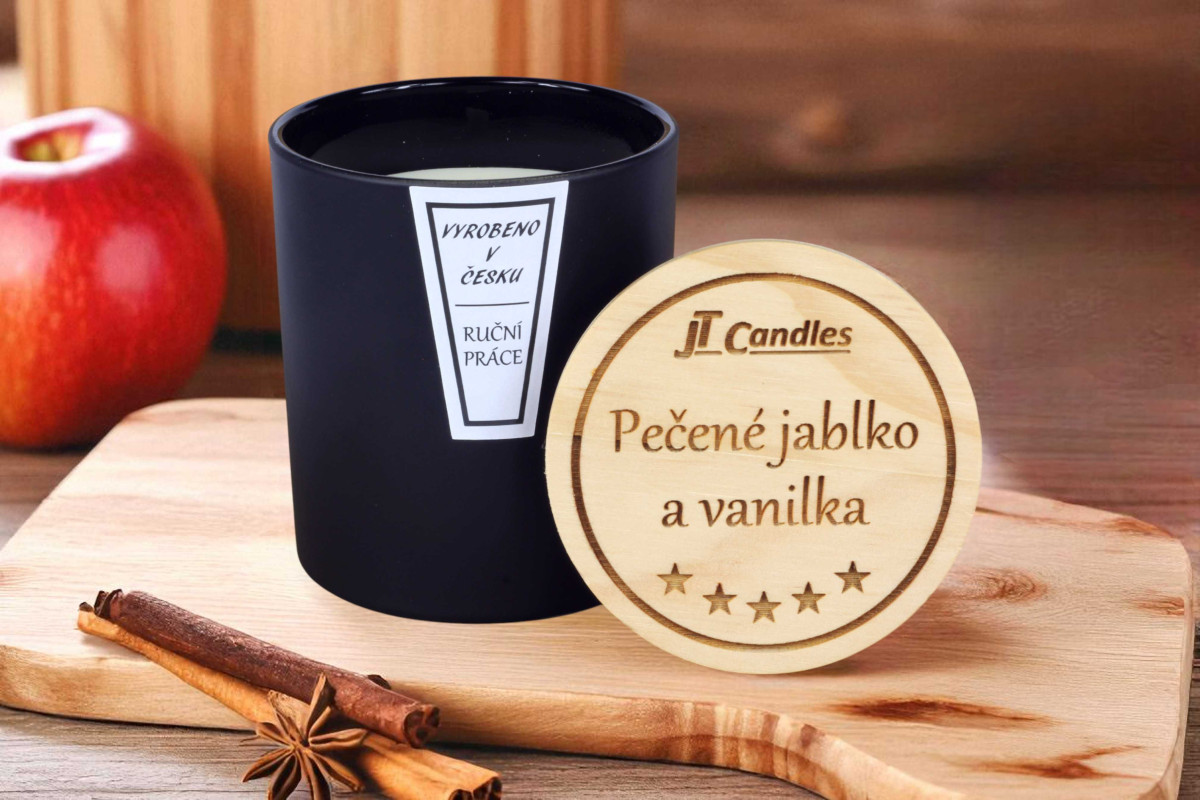 Domů » Svíčky ve skle s dřevěným víčkem » Svíčka ve skle - Pečené jablko a vanilka - černá