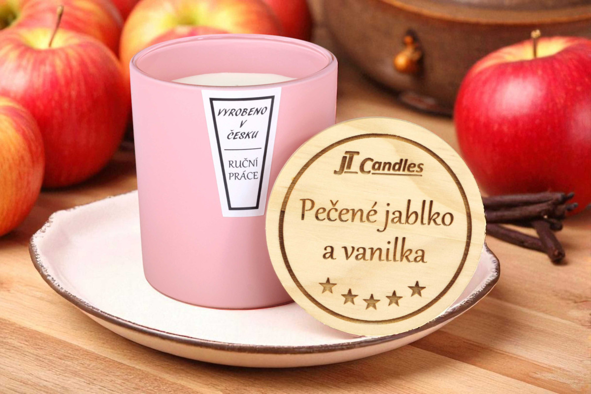 Domů » Svíčky ve skle s dřevěným víčkem » Svíčka ve skle - Pečené jablko a vanilka - růžová